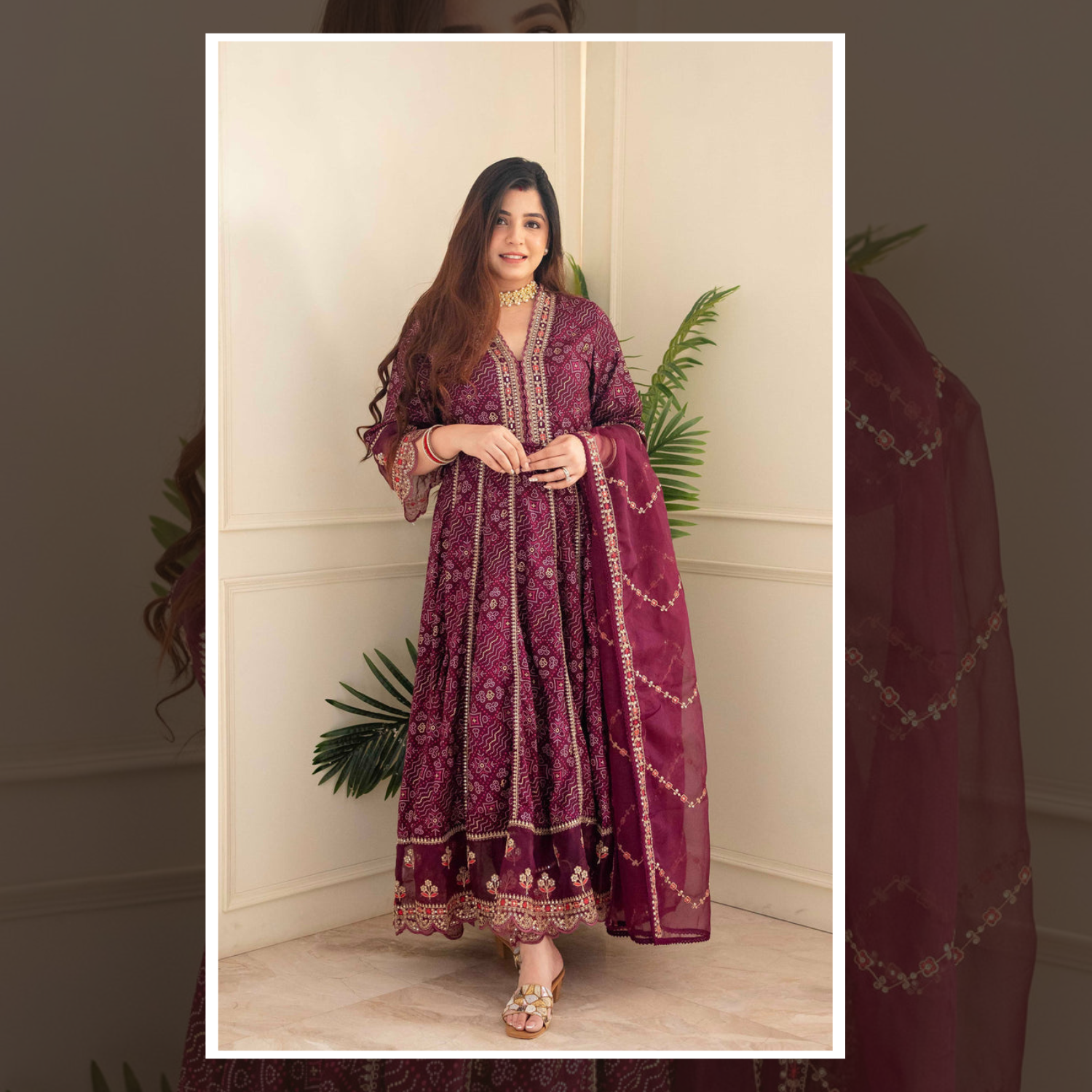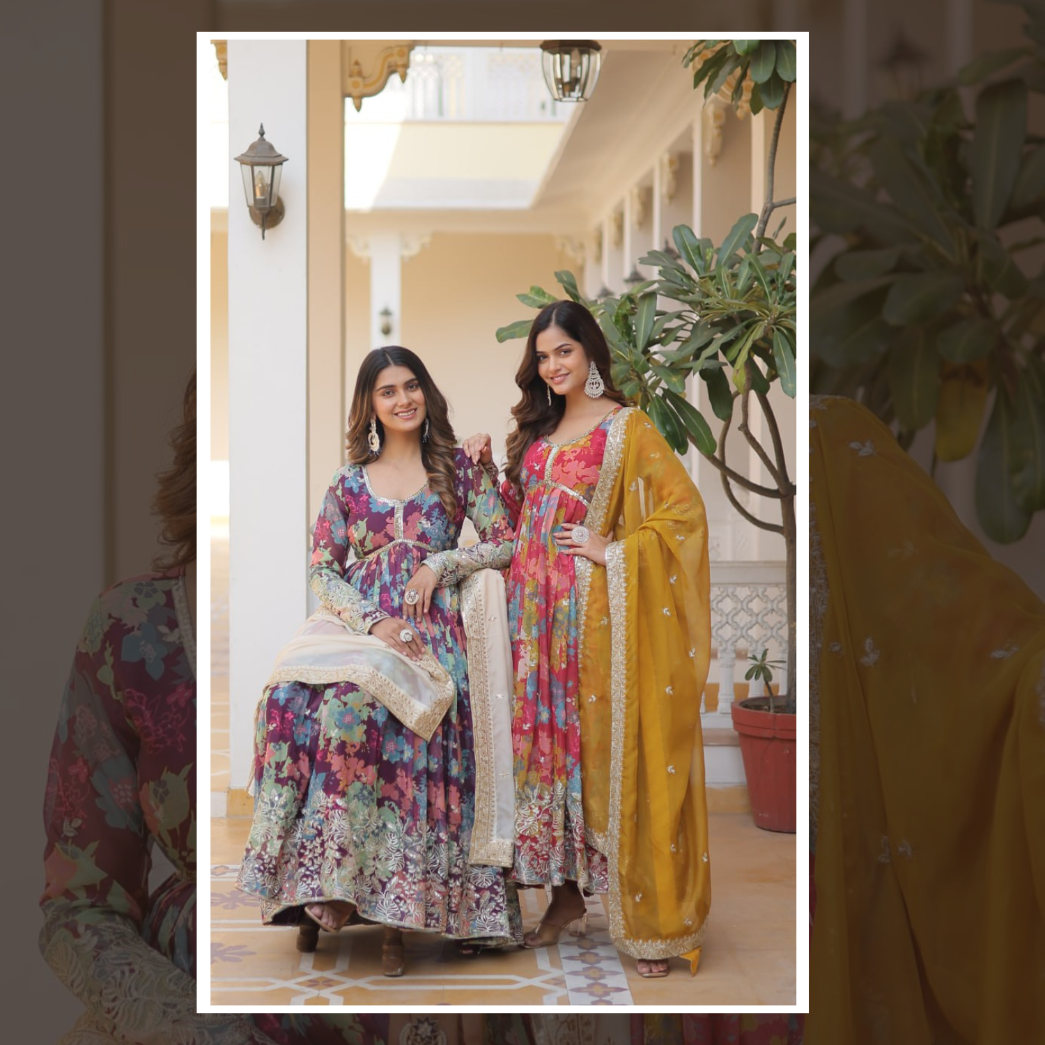 WOMEN'S EMBROIDERED PARTY ANARKALI KURTA SET PAIRED WITH EMBROIDERED ORGANZA DUPATTA & PANT