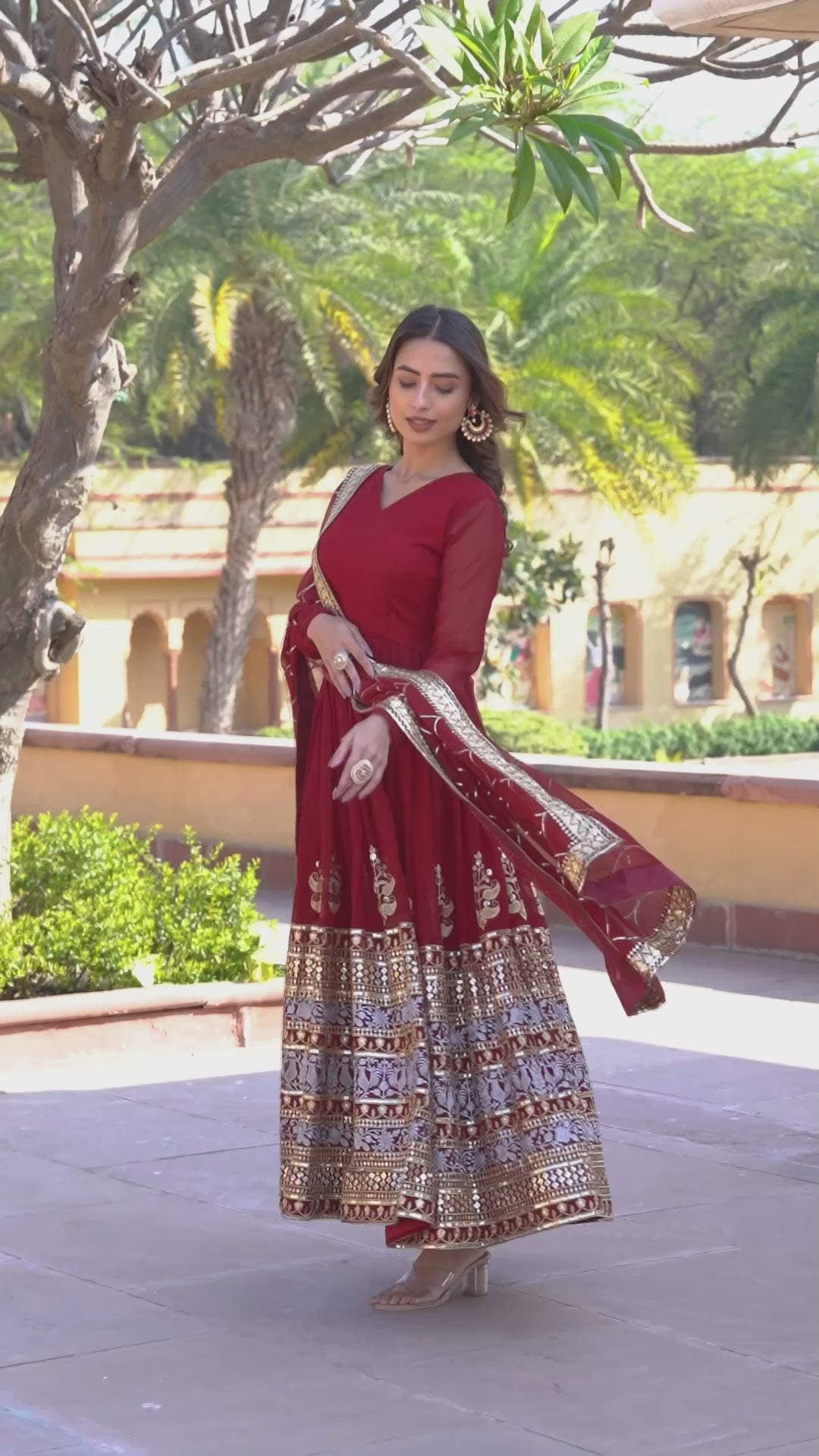 Graceful V-Neck Faux Blooming Gown with Dupatta With Attractive Jari and Thread Embroidered Sequins work with Lace Border.