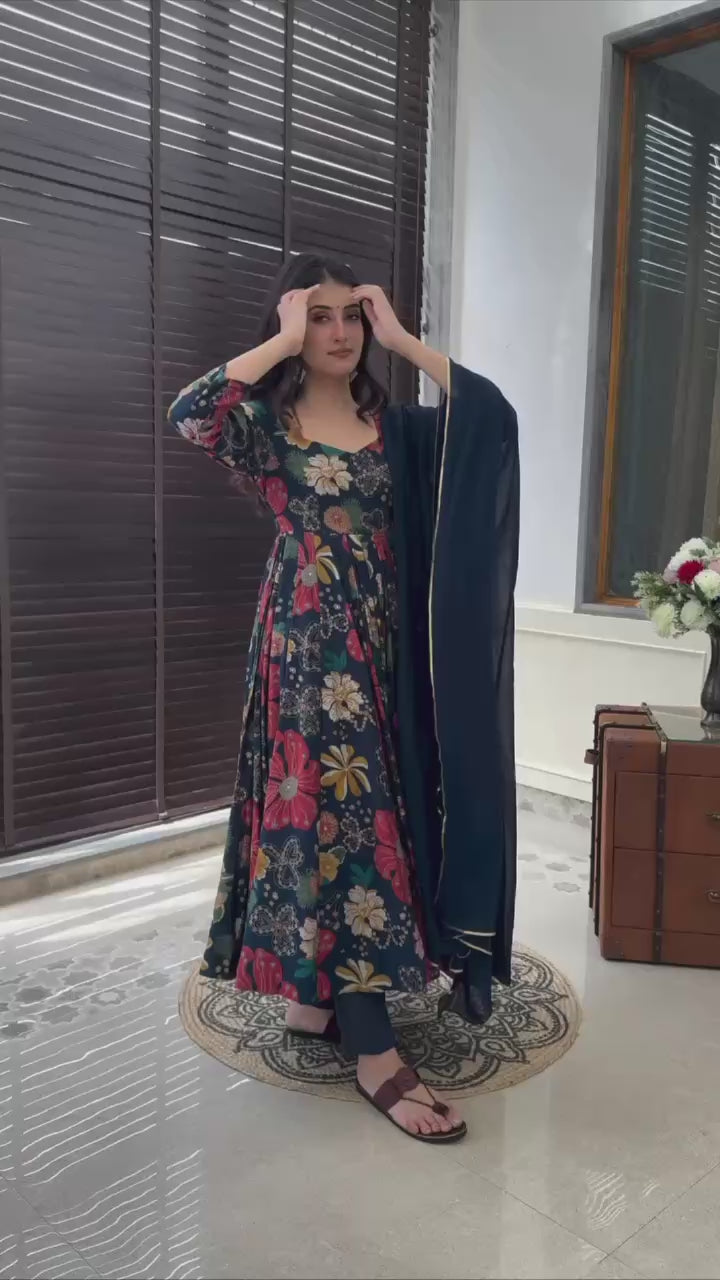WOMEN'S FLORAL FLARED GOWN PAIRED WITH DUPPATTA AND PANT